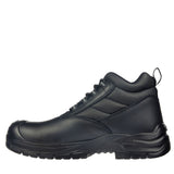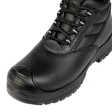 The HAMILTON is your every day safety boot. Designed and manufactured for hard working environments the boot has many performance qualities. It features a dual density PU/PU outsole which is tested and certified to the best slip rating in the 20345:2022 standard, as well as having a scuff cap for extra durability on the toe, and a ladder grip designed to the fire fighters standards. Its upper is manufactured with GRS (Global Recycled Standards) leather, as well as recycled linings throughout. The boot is 100% non-metallic and features composite toe cap and midsole protection. The boot includes an EVA comfort footbed, padded tongue and collar providing all day wearer comfort.