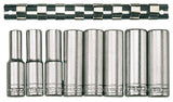 Set of 8 deep 1/2" drive 12 point metric sockets supplied on a clip rail. Made from chrome vanadium steel with a satin finish.