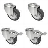 4-piece castor packs containing 2 x swivel and 2 x swivel with brake, pressed steel zinc plated, bolt hole castors. Fitted with a non-marking grey thermoplastic rubber tyre wheel on a grey polypropylene rim.