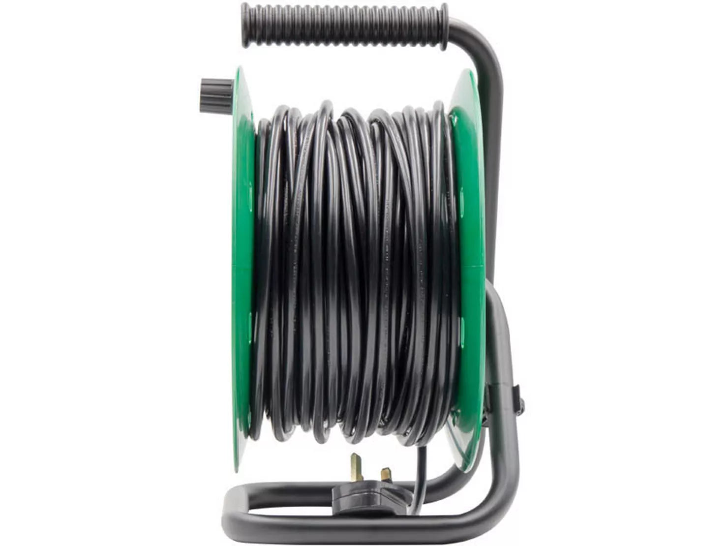 - Drum secured on a metal base with carry handle for ease of use. Small wind handle for easy cable wind in