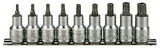 Set of 9 1/2" drive TX bit sockets for internal TX heads. Supplied on a clip rail with a satin finish.