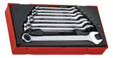 8 piece AF spanner set with the same dimension at both ends. The 12 point ring head is set at a 15° angle. Made from chrome vanadium with polished heads and a Satin finish. The set is supplied in a unique Teng Tools TC tray and can be used either on it's own or as part of the Teng Tools TC control system. The tray features a removable hinged click lock lid and dove tail joints which enable different TC trays to be locked together and used as trays in Teng Tools tool boxes and roller cabinets. All of the tools in the set have their own individual place so lost tools can easily be identified.