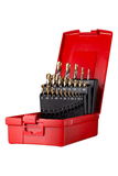 Drill set in standard plastic cassette consisting out of 24 stub length drills with straight shank, A022 diameters 1.0 up to 10.5mm in increments of 0.5mm and 3.3, 4.2, 6.8 and 10.2mm, according to DIN/ANSI standard with 135° split point, HSS with TiN-tip coating for 2.5xD drilling without pecking in steel and cast iron (above 2.0mm with bright finish and conical point)