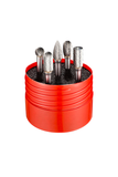Rotary burr set in plastic TUBE-BOX, consisting of 5 carbide burrs with DC double cut flute style with close spaced edges for steel and cast steel, stainless steel, cast-iron, copper or copper alloys, high-temperature alloys, hardened materials, diameter 9.6 mm with 6 mm shank, 1 off each P803 cylinder burr with end cut (B shape), P805 cylinder burr with ball nose (C shape), P807 ball burr (D shape), P809 oval burr (E shape) and P813 pointed tree burr (G shape)