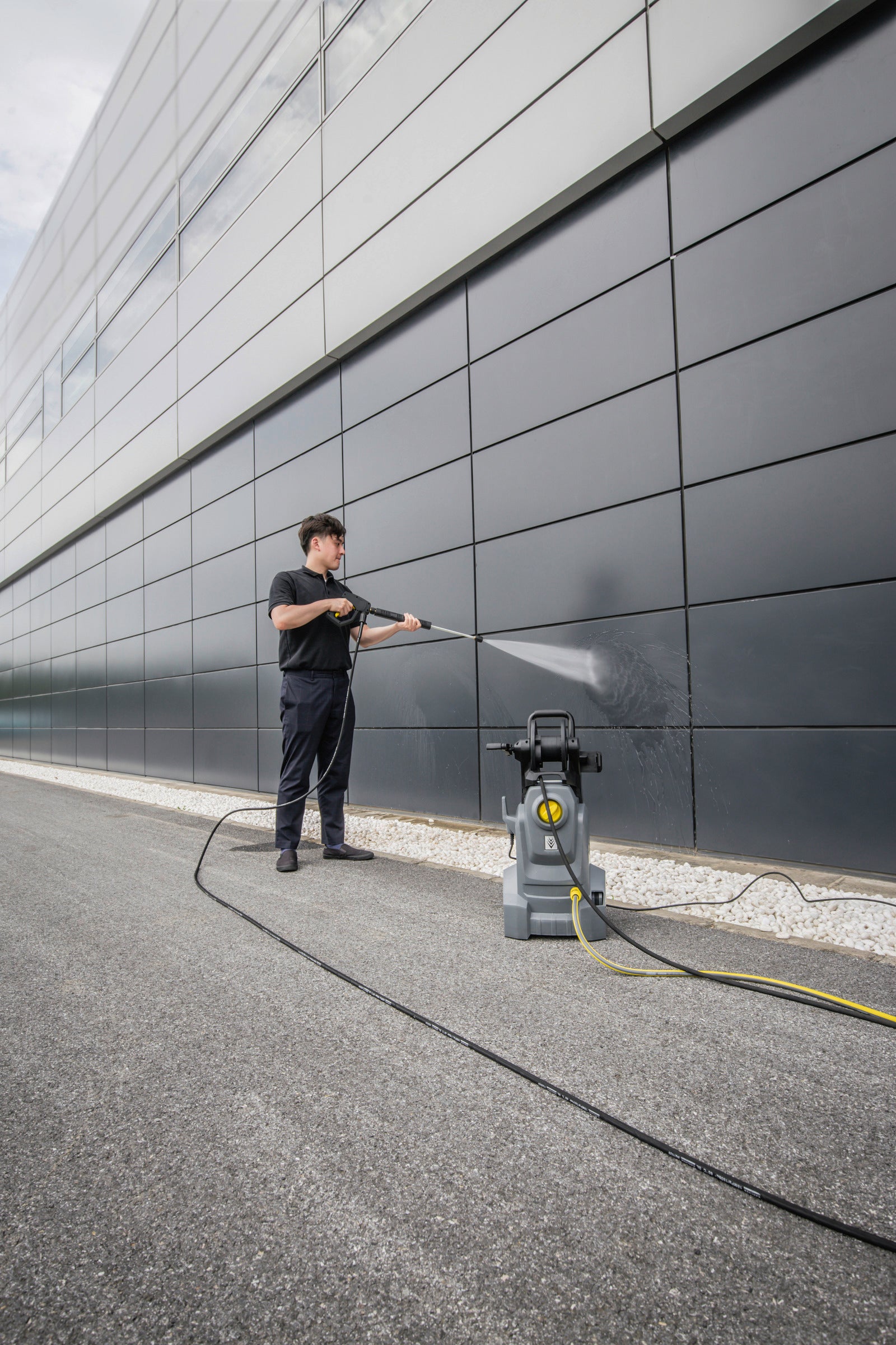 Ergonomic, mobile, powerful and compact: The HD 4/10 X Classic high-pressure cleaner impresses with its durable and reliable components such as the three-piston axial pump and an induction motor, as well as its compact and robust design. The automatic pressure relief system effectively protects the hydraulic components, thus ensuring a long lifetime and very low repair and maintenance costs. Furthermore, it reduces the traction force on the trigger gun, thus allowing long, fatigue-free periods of work. The ergonomic and user-friendly HD 4/10 X Classic is extremely easy to use and, thanks to its integrated hose reel and retractable pull handle, ensures a high degree of user comfort. With a working pressure of 100 bar, an hourly water volume of 400 litres, and stable wheels for easy transportation and high mobility at the site of use, the HD 4/10 X Classic high-pressure cleaner is suitable for diverse applications, for example in the building industry or for occasional vehicle cleaning.