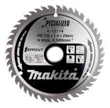 The Makita Efficut TCT Wood Cutting Saw Blades are up to 2.5 times faster cutting compared to a standard saw blade. The new tip design reduces the contact with the material, increasing the efficiency of release waste and has a sharper bevel angle. Cuts with the Efficut Blade are therefore more efficient and the battery lasts up to 2.4 times longer when compared to a standard blade.