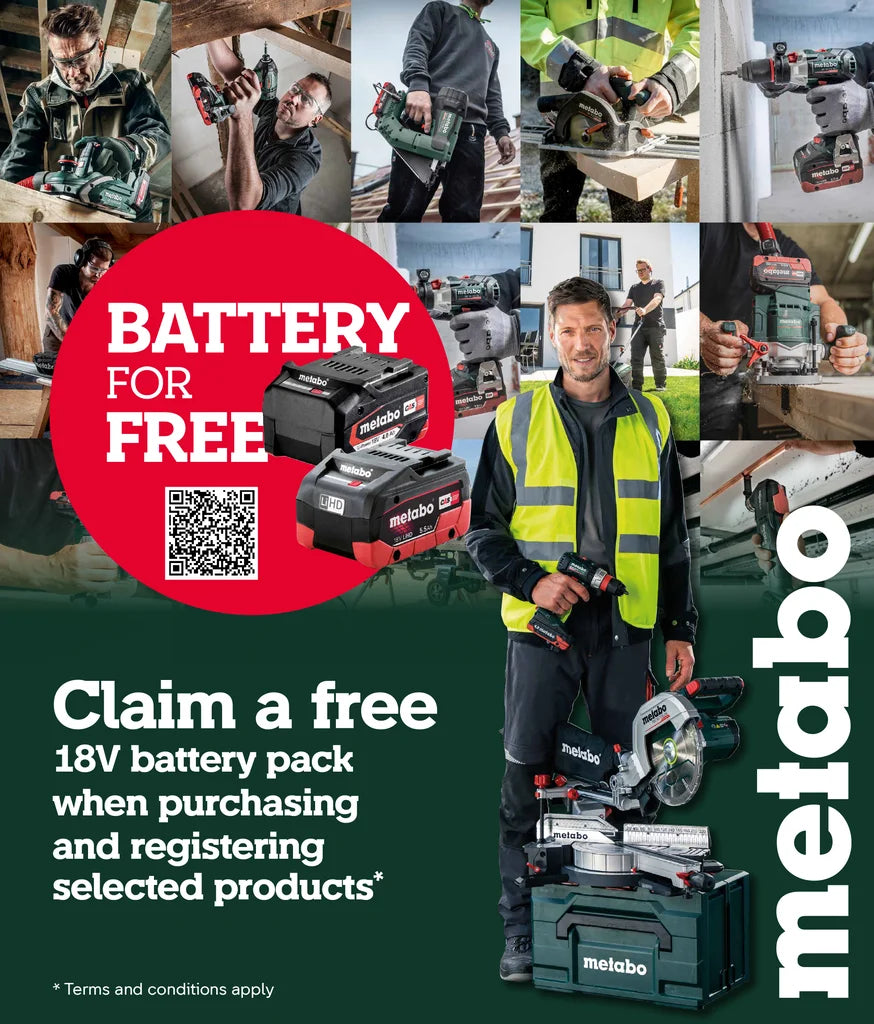 Free 18 volt battery when you register the tool on the Metabo Website.